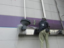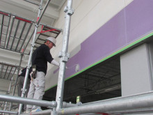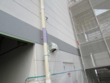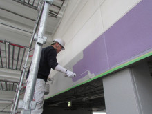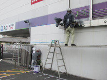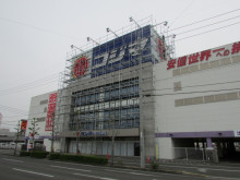 先日看板取り替え用の足場工事も無事完了し今日は外壁の塗装。