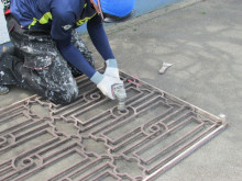 磨き上げた面格子を親方が2液性エポキシ系錆止めを塗布しています。