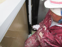 アルミ部分は素材の膨張率が高いため下地にエポキシ系のプライマーを入れ、上塗りは弾性系のシリコンで仕上げます。