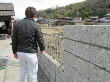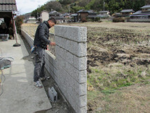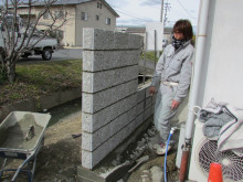 積み上がった化粧ブロックの目地詰め作業↓