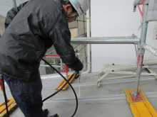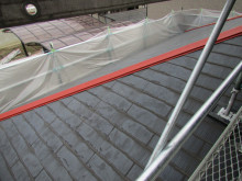 昨日仮設足場が終わり本日より高圧洗浄。外壁洗浄は通常の圧力で洗いますが屋根は下地がガルバニュウム鋼板ですからケレンをしっかりやり高圧洗浄で更に基材に対し傷を入れます。