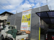 先日仮設工事→シーリング打ち変え→高圧洗浄→乾燥養生と工事が進み昨日から養生貼り。」