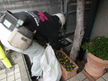 下の写真はシーリングを切断した時のゴミを拾っています、切断するときに使用するカッターナイフの歯が落ちている場合もありますから都度清掃し綺麗な現場つくりを心掛けています。