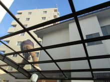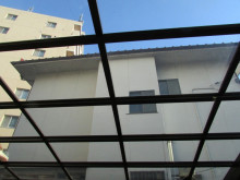 カーポートのアクリル板は長年の間にチリ・ホコリが堆積し焼きついた状態となってます。今回は足場を架ける時にアクリル板が邪魔になったので取り外しました。そこで取り付け前にクリーナーを付けゴシゴシ洗浄しました。 ごらんのように空がきれいに透けて見える状態となりました。