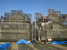 現場の進捗状況はまだ1棟目の下地処理(微弾性フィラー)が終わったばかり。