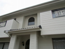 先日お引渡しのお客様で岡山市芳賀佐山H様邸のタッチアップに行きました。足場をばらす時に玄関正面の樋をキズ付けてしまい一部新しい物と交換させて頂きました。