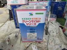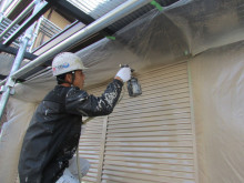 これから仕上げ吹きです。使用材料はSK化研クリンマイルドシリコン。外壁色と同じ色で仕上げていきます。
