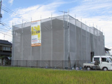 足場→洗浄→養生→シーラー処理この段階まできました。今回の工事はサイディング板に御影石調の仕上げを施工します。その前処理です。