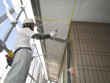 シーラーという材料を吹付けてます。この工程は洗浄後に差サイディングと上塗りの密着を良くするために行います。