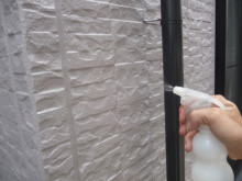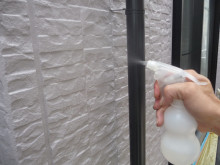 検査の最後に外壁K2コート(フッ素樹脂系光触媒)の親水試験。霧吹(雨を想定)で水をかけます。