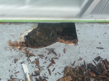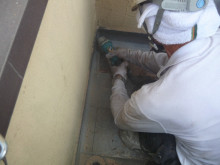 2FベランダのFRPの床がフニャフニャするから見て欲しいとの依頼。現調してみると下地のコンパネ(ベニア板)とFRP防水が破断している状態。