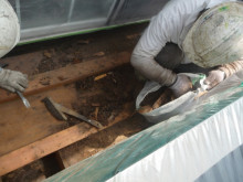 昨日の作業は腐食した木材の撤去。その後に新たな木材(根太)を入れ替えました。表層の部分はコンパネ(下地ベニア)を貼り下地完了。