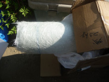 このガラス繊維のような巻物がFRPのマット。これをベランダ全体に敷き詰めポリエステル樹脂を流します。