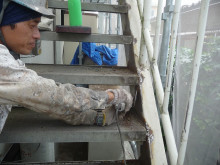 この階段は踏み板付近の劣化が激しく通常の工具ではでケレンしても落ちないためサンダーケレンするよう指示しました。