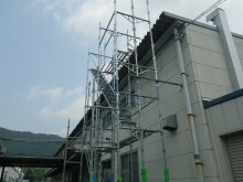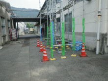 仮設足場も施工計画通り設置しフォークリフトや社員様の通行の妨げにならないよう設置しています。また仮設足場の角にはクッション養生を設け怪我を防止します。