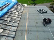 下地が終わりルーフィングを貼った状態。この屋根は勾配が取れないためルーフィングを更にもう一枚貼り2重貼りします。こうしたちょっとした事が今後漏水防止に繋がるんですよね。