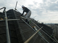 最近流行のボルタリング状態。この屋根は6寸勾配といい国の指導で必ず屋根足場をしないといけないんですよね。てか、なかったら上がれないし転落しますよね管理している僕でも6寸勾配の屋根はかなり怖いです