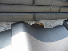 屋根に上がって現調してると げ、げ、げ、げっ・・・・。また棟の漆喰が劣化して剥がれ落ちてる。このままだと漏水の原因に・・・