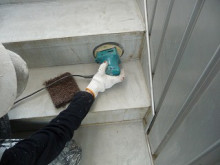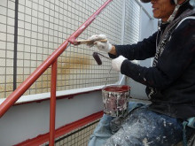 まずはいつもお世話になってますS様の本社外部階段塗装。昨日足場を掛けて今日はサンダーケレン&錆止め施工