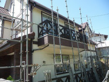この輸入住宅はハーフティンバーといい外壁の各所に梁・柱が取り付けてあり全て塗装します。