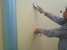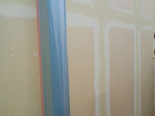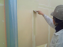 このPB(ブラスターボード)のジョイントに寒冷紗を貼り割れを防止します。この作業を怠ると壁がすぐに割れちゃいます。ですので必ず寒冷紗は必要なんですよね。
