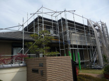 今日は朝からK様邸に訪問しました。昨日足場掛けが完了し今日は養生シート貼りと外壁シーリング撤去打ち替え工事です。とれに伴い塀のクラック(ヒビ割れ)もシーリングを充填するため現場で指示をしました。