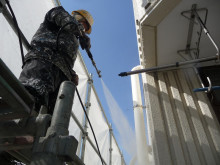 本日の作業は高圧洗浄。この工程をする事で今まで何年もの間、建物に堆積していたチリ・ホコリ・カビ・藻を除去します。除去しないで塗装した場合はどんな性能の良い塗料でもすぐに捲れてしまいます。塗装工事においても下地調整は重要です。