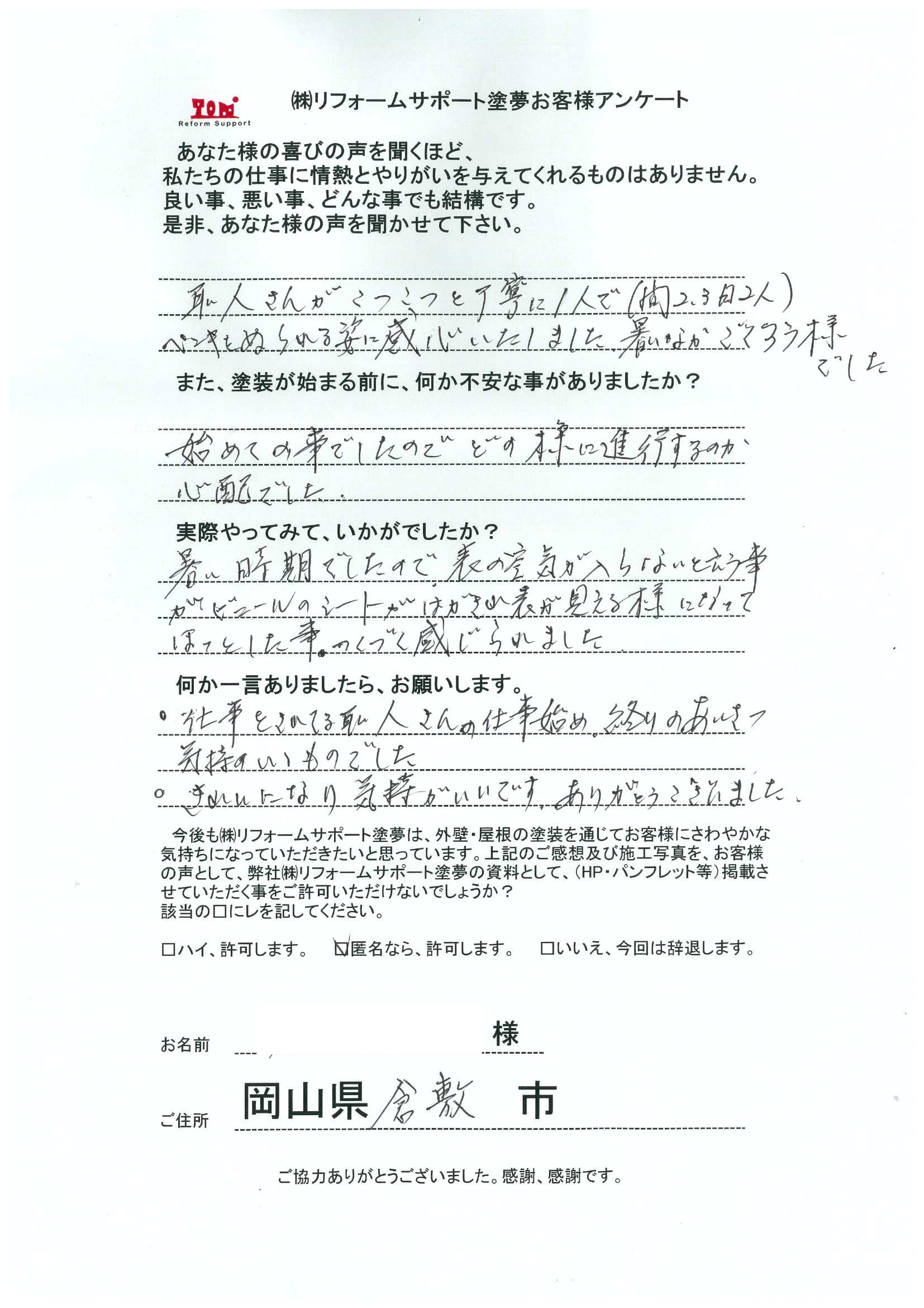 職人さんがこつこつ丁寧に1人で(間2,3回2人)ペンキを塗られる姿に感心いたしました。暑い中ごくろう様でした。塗装が始まる前に何か不安な事がありましたか?