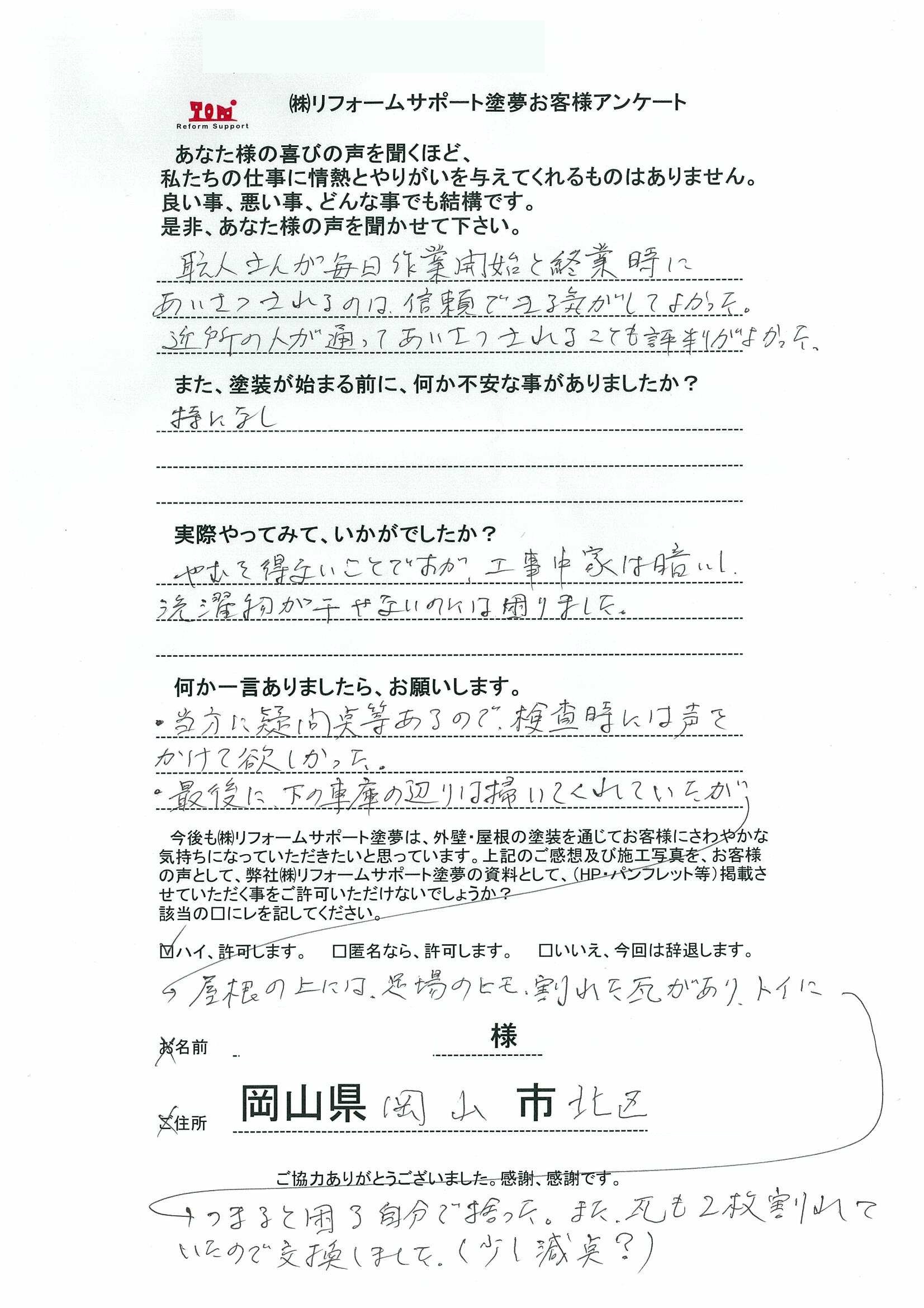 職人さんが、毎日作業開始と終業時にあいさつされるのは信頼できる気がしてよかった。 近所の人が通ってあいさつされることも評判がよかった。塗装を実際にやってみて、いかがでしたか?