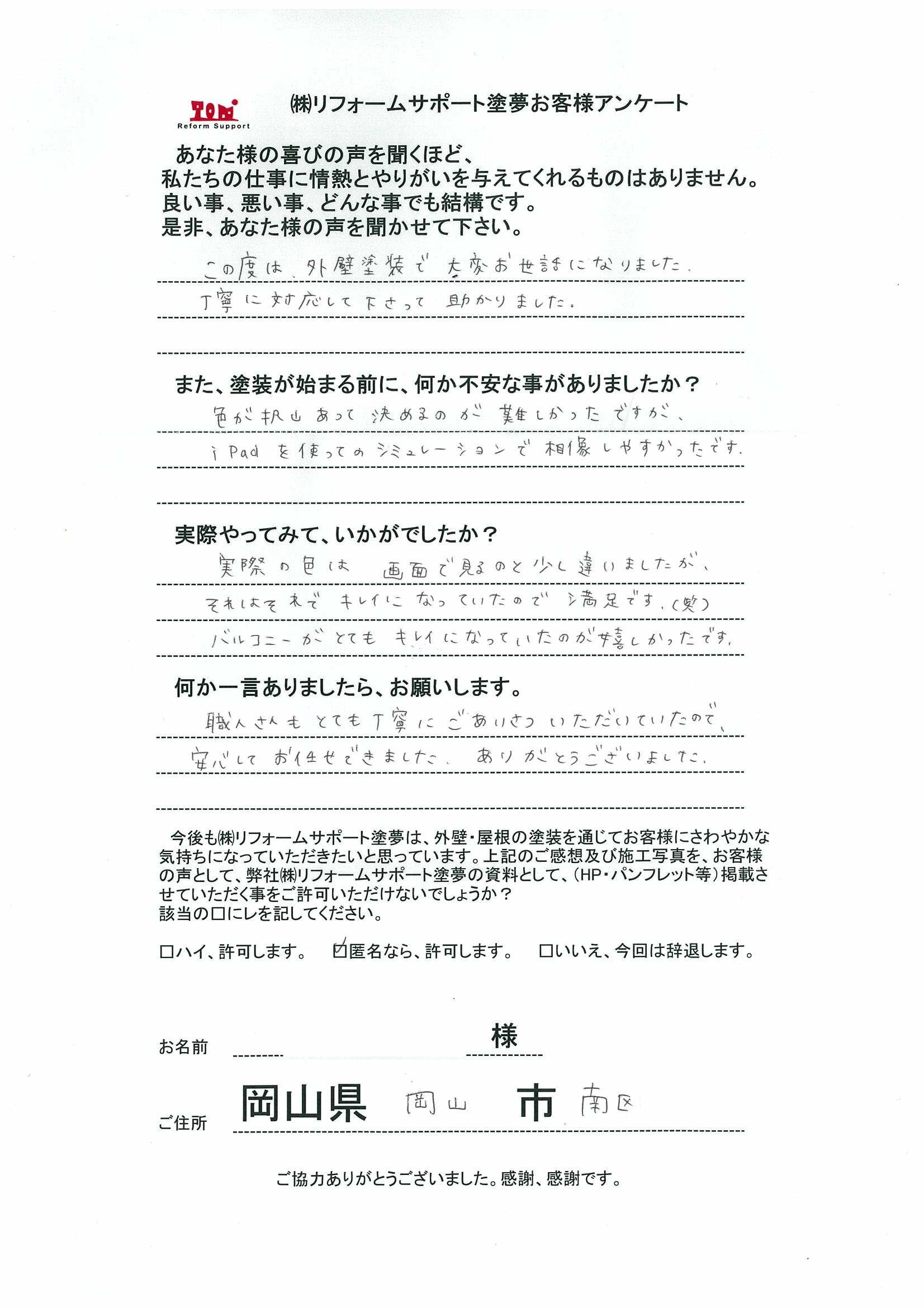 岡山市南区で外壁塗装を無機塗料で塗装されたお客様の声