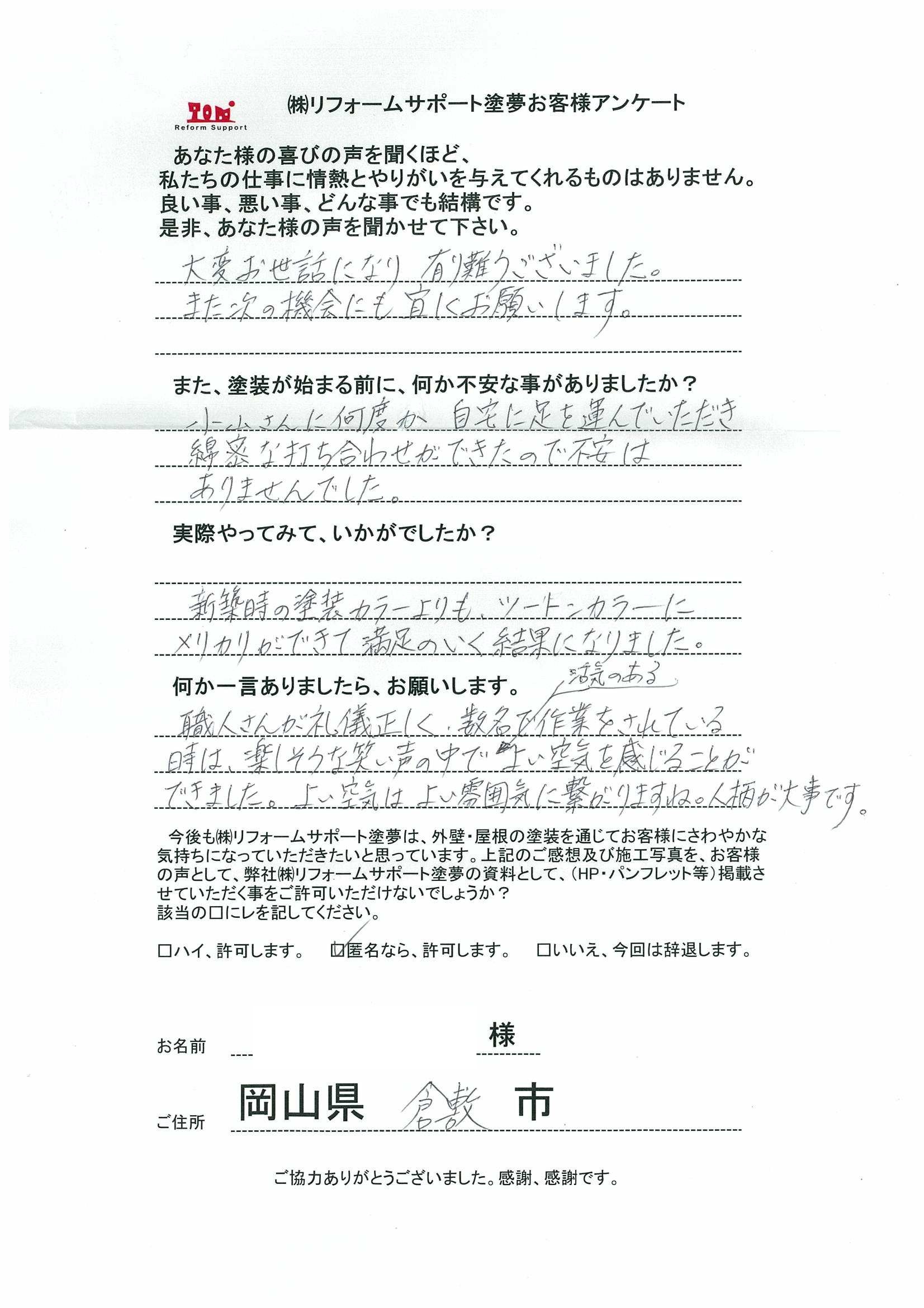 新築時の塗装カラーよりも、ツートンカラーにメリハリができて満足のいく結果になりました。何か一言ありましたらお願いします。