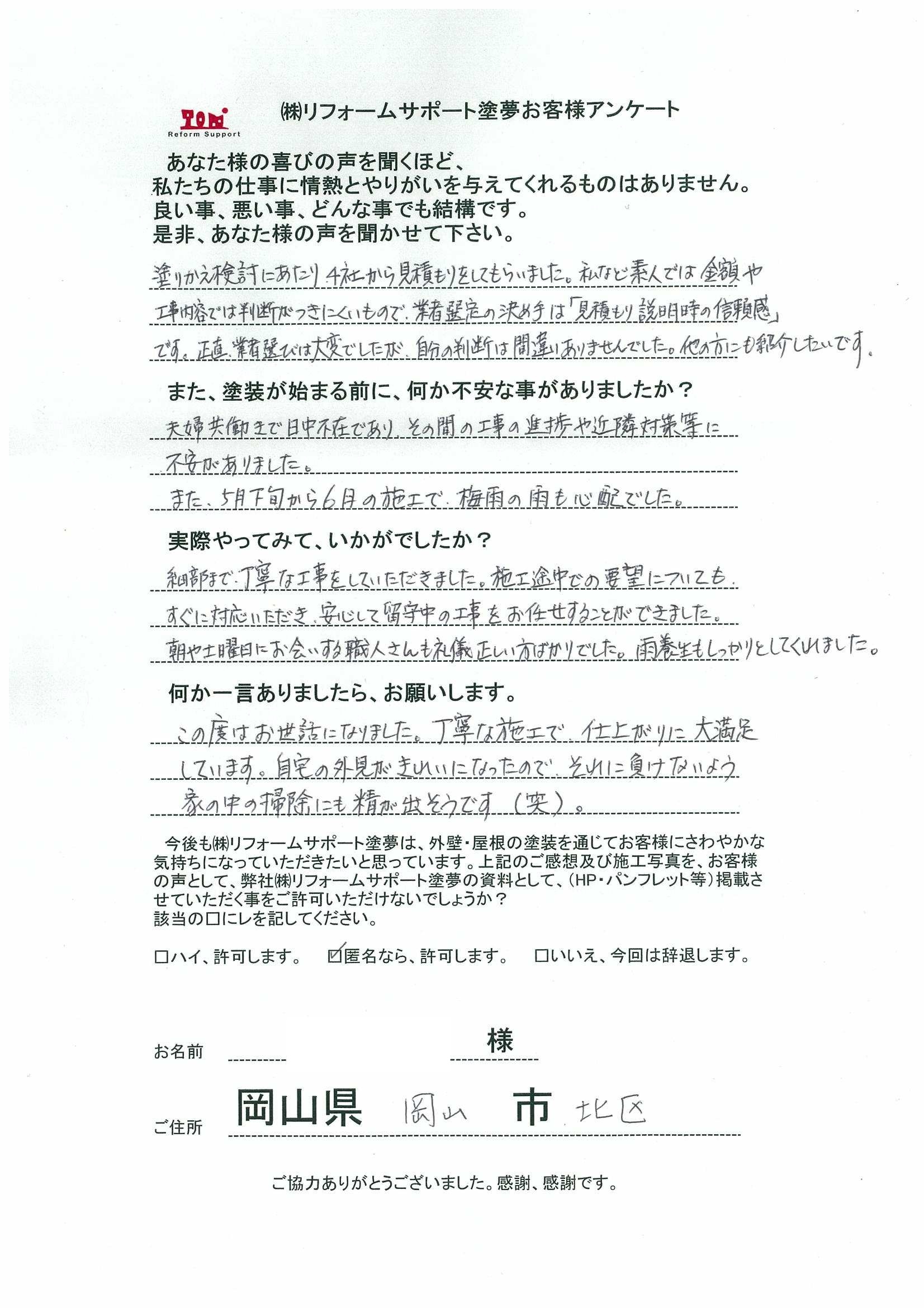 岡山市北区 外壁塗装と屋根葺き替えをしたお客様の声