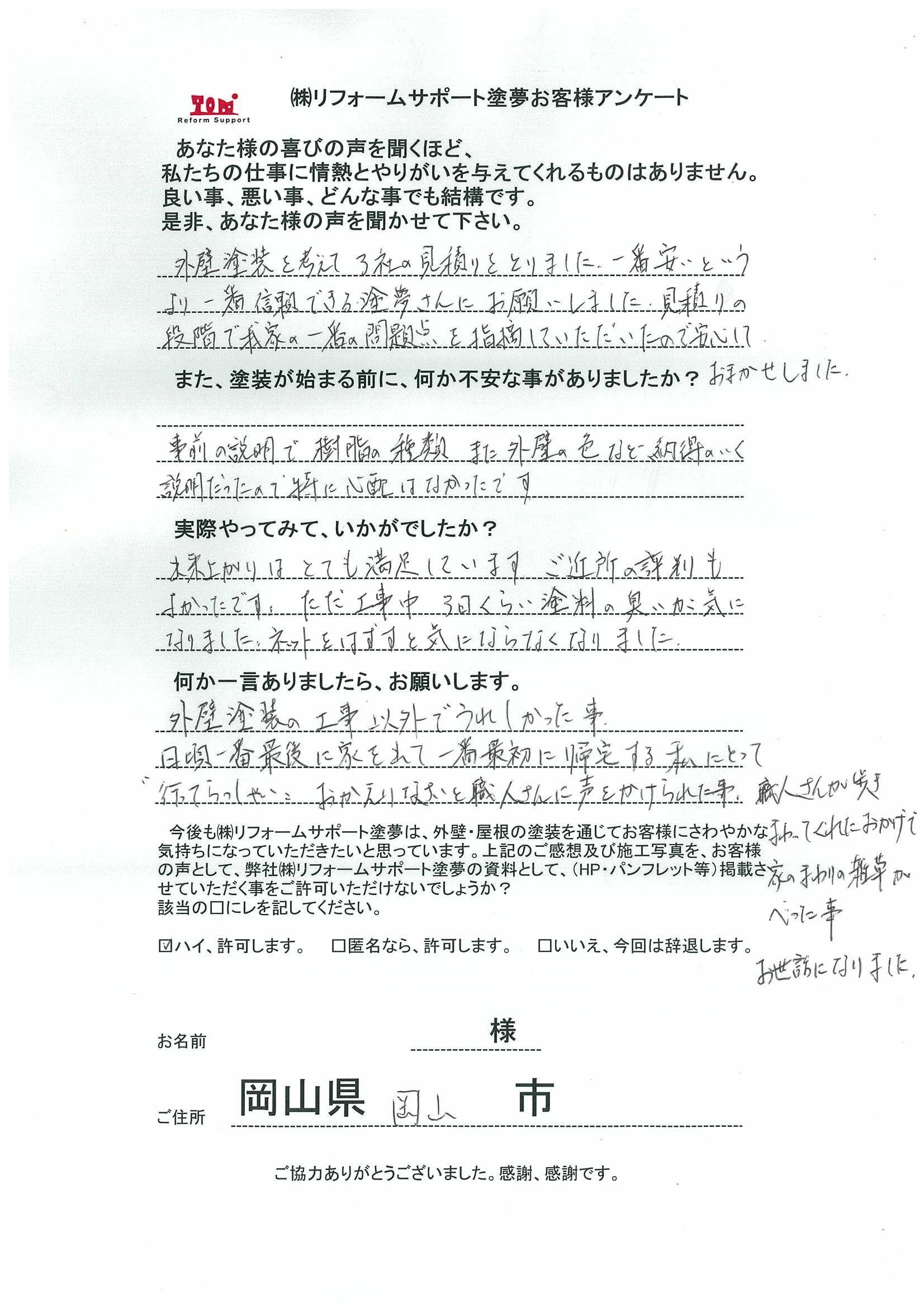 岡山市で屋根は無機、外壁はアウトレットで塗装をしたお客様の声
