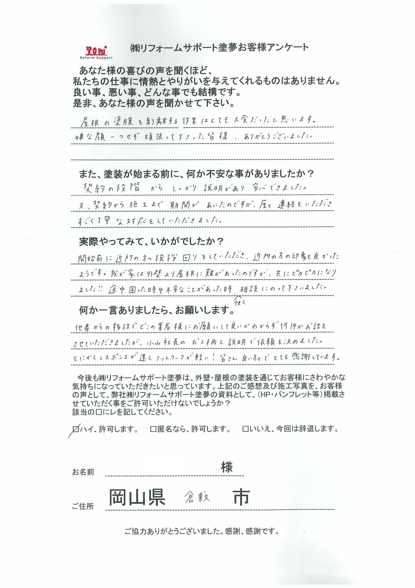 倉敷市 アウトレットプランで屋根と外壁塗装をされたお客様の声