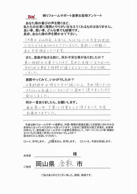 この度は、小山社長、上坂さん、入江さんには大変お世話になりどうもありがとうございました。真新しい外観に戻り、大変満足しています。塗装が始まる前に不安な事がありましたか?
