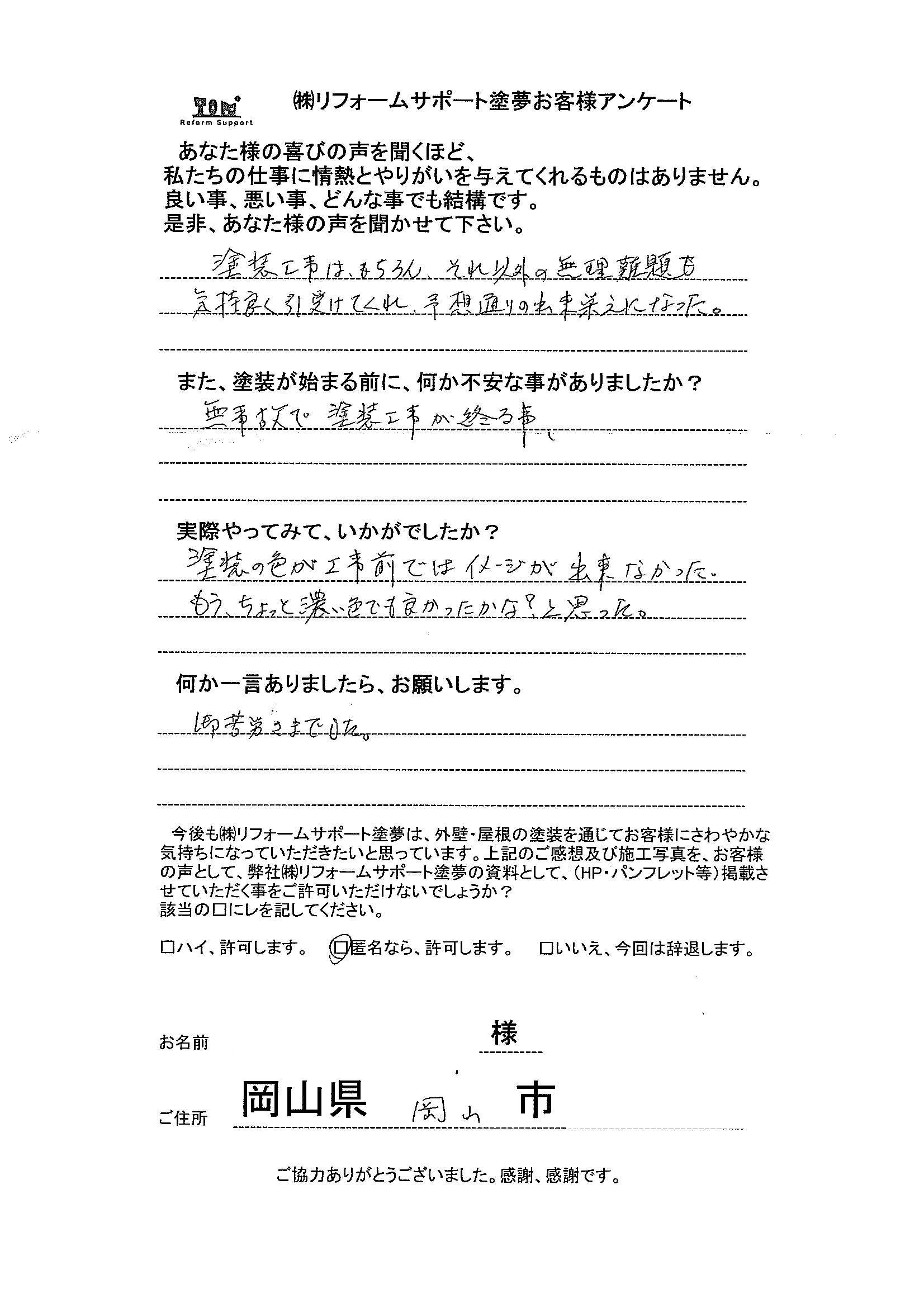 塗装の色が工事前ではイメージが出来なかった。もうちょっと濃い色でも良かったかな?と思った。何か一言ありましたらお願いします