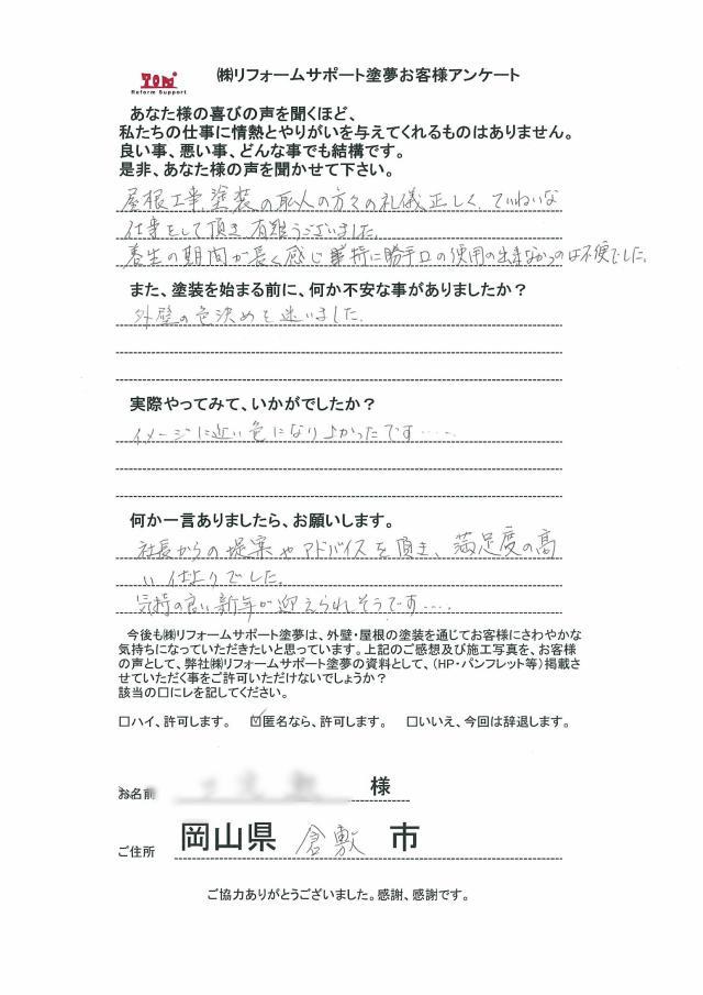 屋根工事、塗装の職人の方々の礼儀正しく、ていねいな仕事をして頂き有難うございました。