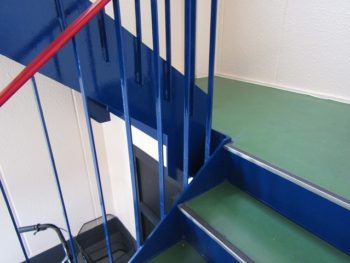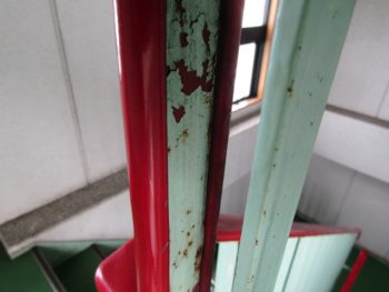 階段は錆が多くありました。丁寧にケレン作業し撤去して塗装いたします。塗料にはフッ素樹脂のセミフロンマイルドを使用しました。長く美観を保ちひび割れもしにくくなります。紫外線による劣化にも強いですのでご提案させていただきました。