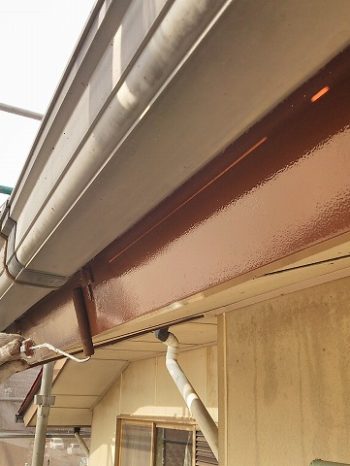 屋根は劣化によりかなり色が剥がれている状態でした。外壁のシーリングは破断しているところがありました。撤去し打ち替えをします。玄関の樋は老朽化しています。交換します。