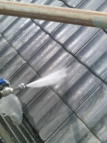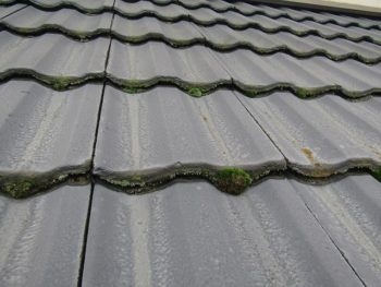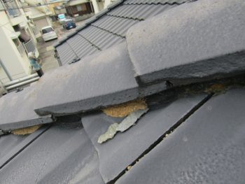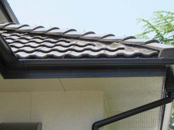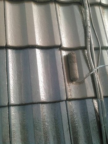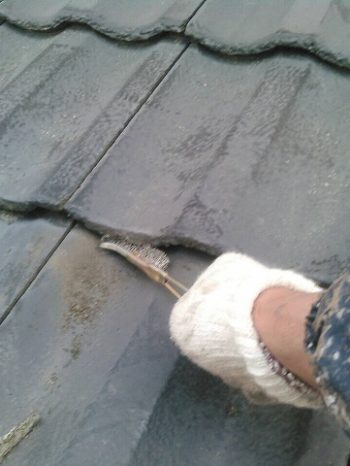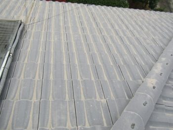 モニエル瓦の劣化が特に著しく、漆喰部分が剥がれ落ちているところがありました。補修をして塗り替えます。塗料は、紫外線を浴び続けても劣化や色あせが少なく、ひび割れも汚れも抑える効果が高い、無機質系塗料をご提案させていただきました。