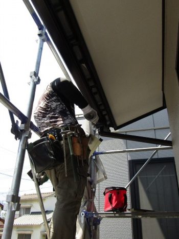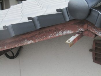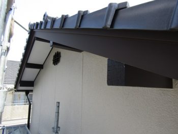 - 破風は木で塗膜が剥がれ、木部も傷んでいました。塗装より木の破風が劣化しない板金を巻く工事をご提案いたしました。