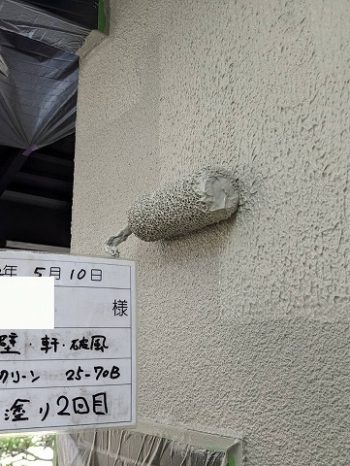 外壁がモルタルですのでどうしてもひび割れは起きてきます。ひび割れを起きにくくするため、塗料を山上げしてから塗装す方法で塗装しました。