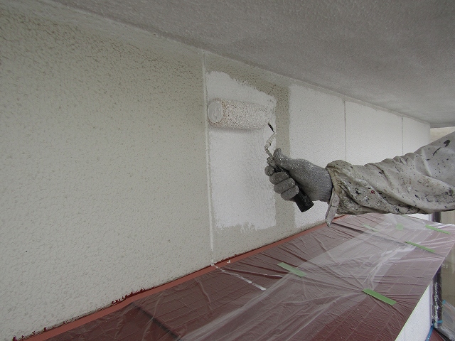 - 外壁塗装の下塗りです。微弾性のサーフを使い、塗膜を山上げしていきます。